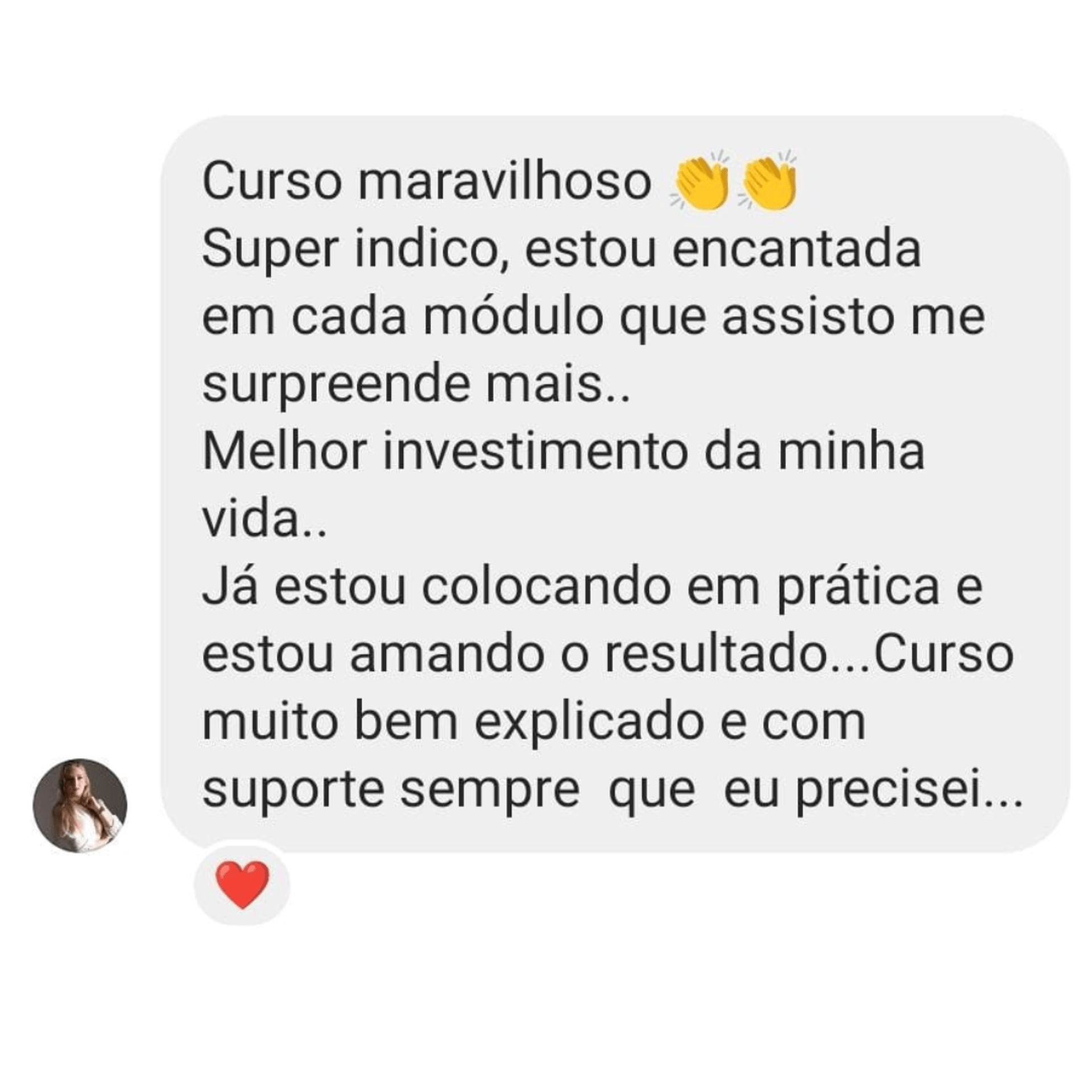Foram vários anos de trabalho e muitos testes para formatar o modelo ideal que me permitiu ter agenda lotada e escolher os clientes que eu atenderia. Agora isso tudo está disponível para você de forma detalhada e totalmente prática, nesse curso que eu preparei com muito carinho.